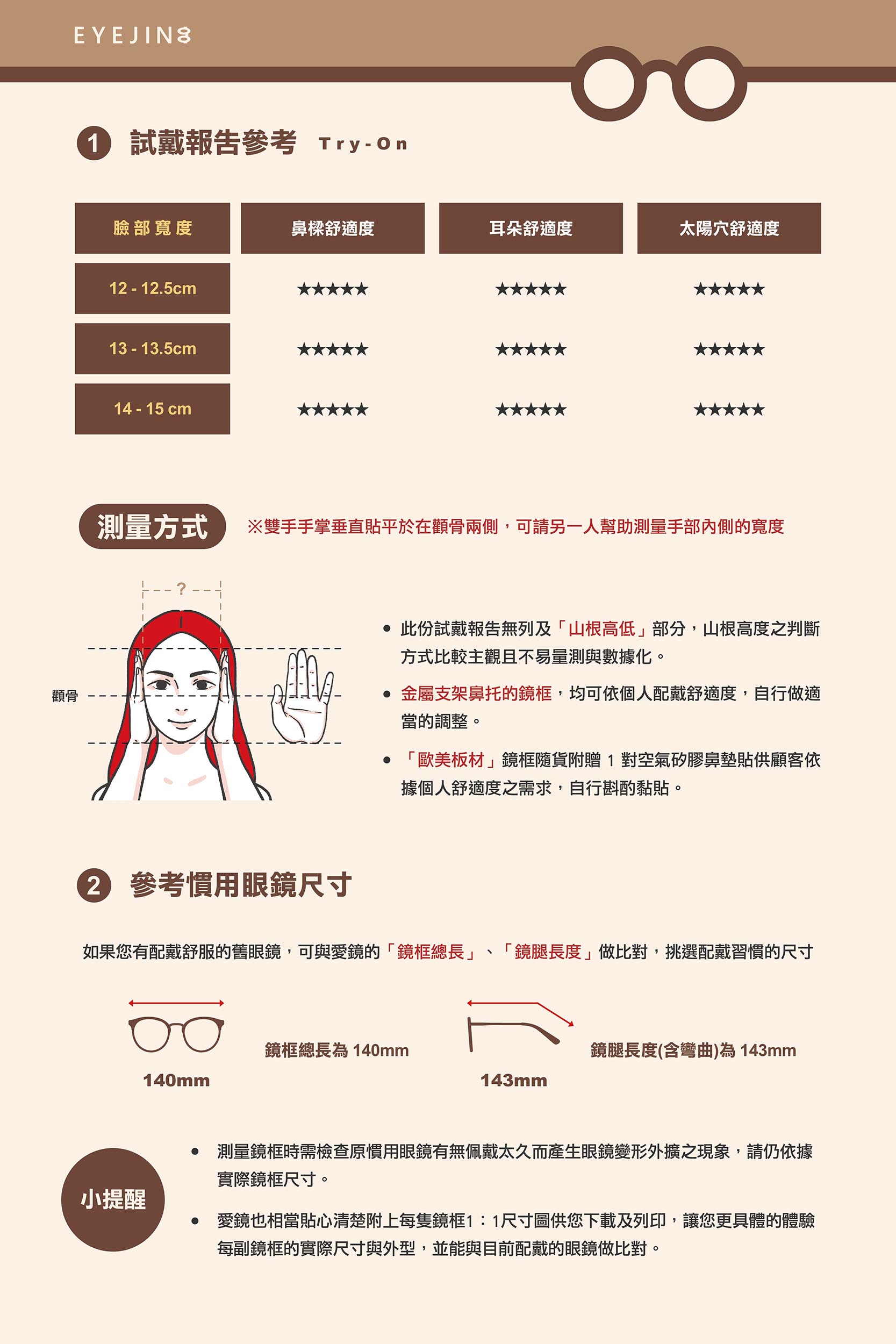 - 鏡框重量皆含原廠壓克力鏡片(平均重量約 5~7 克);如搭配客製化的光學鏡片,重量會依度數深淺、面積厚度而有些許差異。