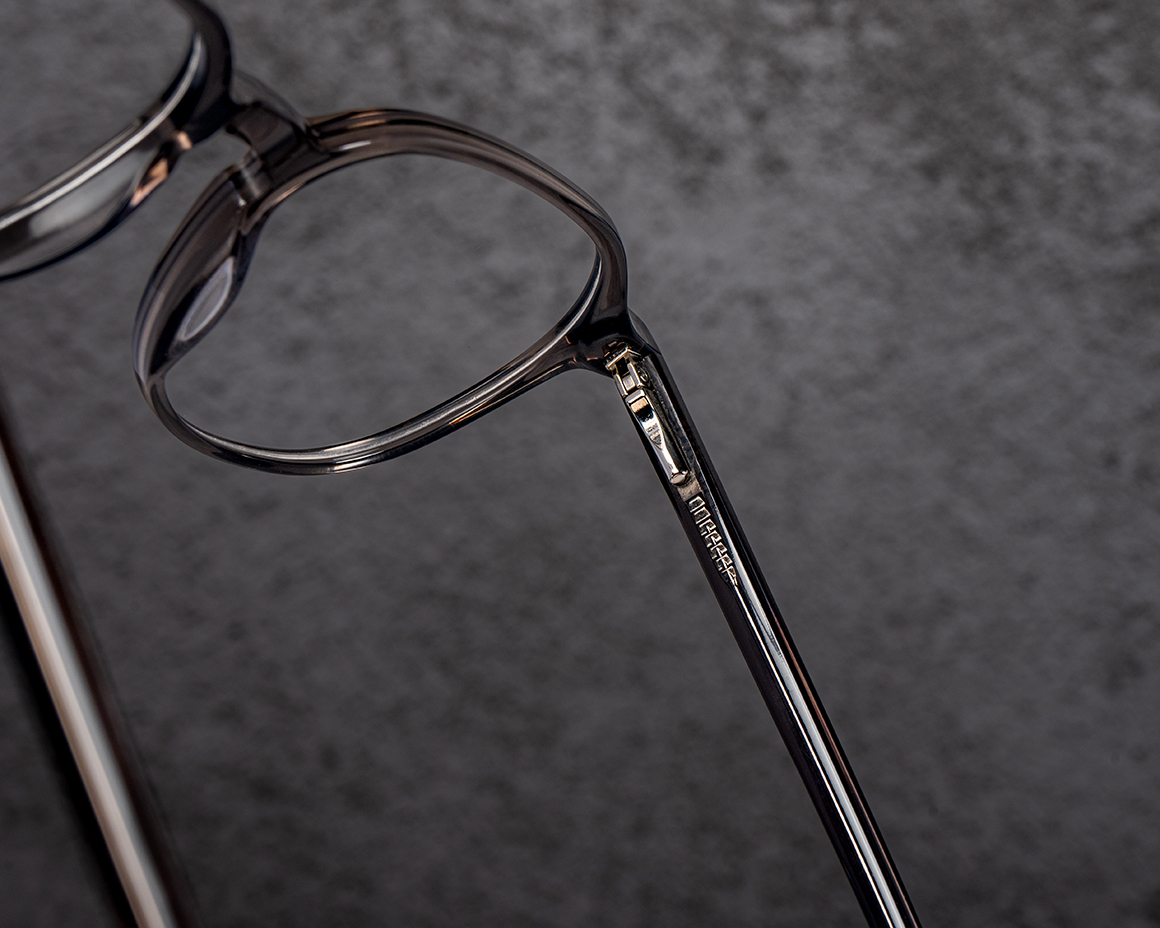 波士頓鏡框搭配前緣平頂設計,讓臉型更立體,配戴起來更時尚。透明鐵灰板材鏡框具有沉靜柔和氣質,並能減輕視覺上的厚重感,充分展現不同風格的個性效果。