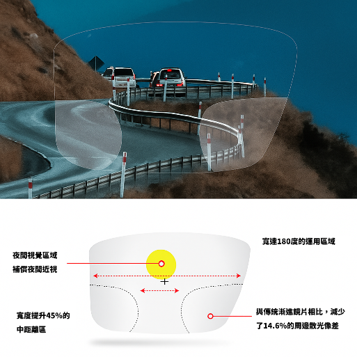 駕駛漸進多焦相比通用的漸進多焦鏡片寬度增加了 70%,中上區域寬度增加了 45%。可為配戴者帶來更為寬闊的道路、儀錶板和後視鏡視野。
